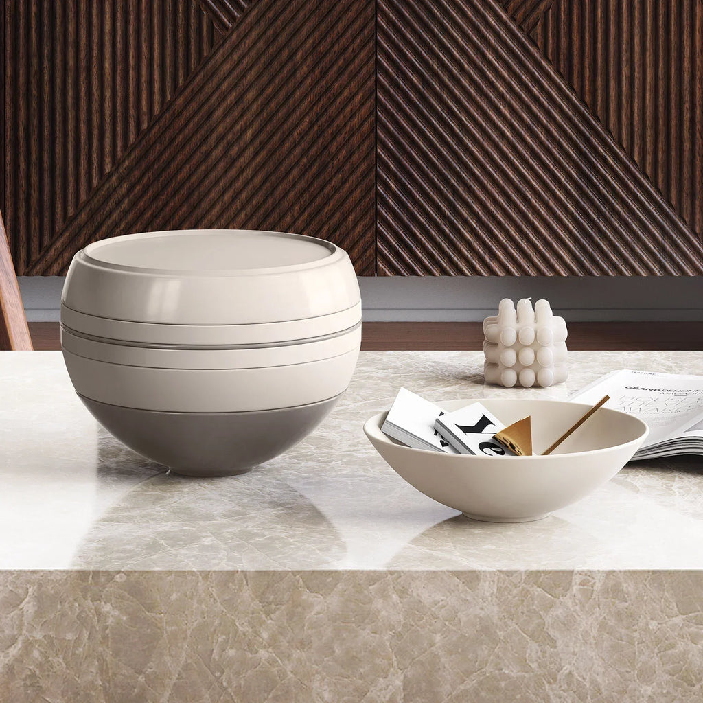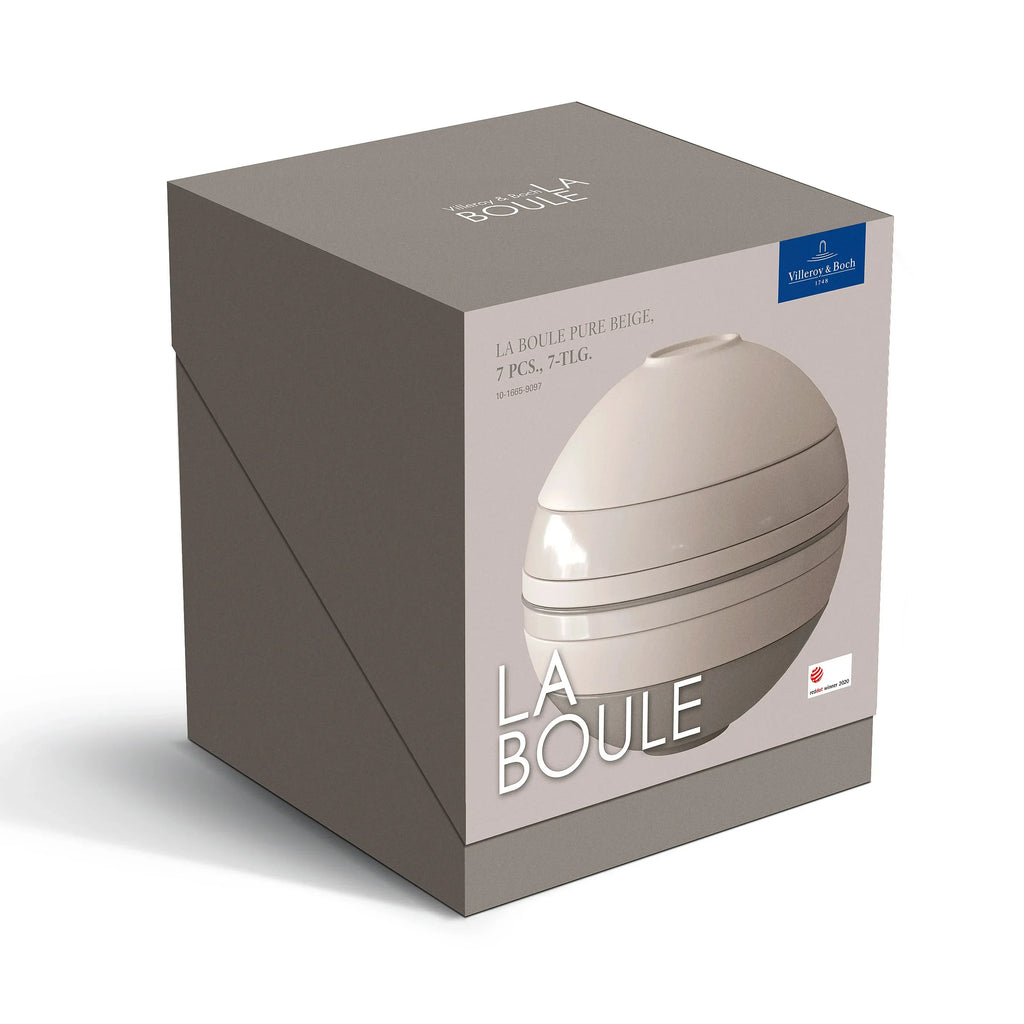 A esfera La Boule é um conjunto de artigos de porcelana de qualidade premium concebidos para duas pessoas. Dois pratos planos, dois pratos universais, duas saladeiras e uma travessa se conectam magicamente e aparecem na forma de uma bola.